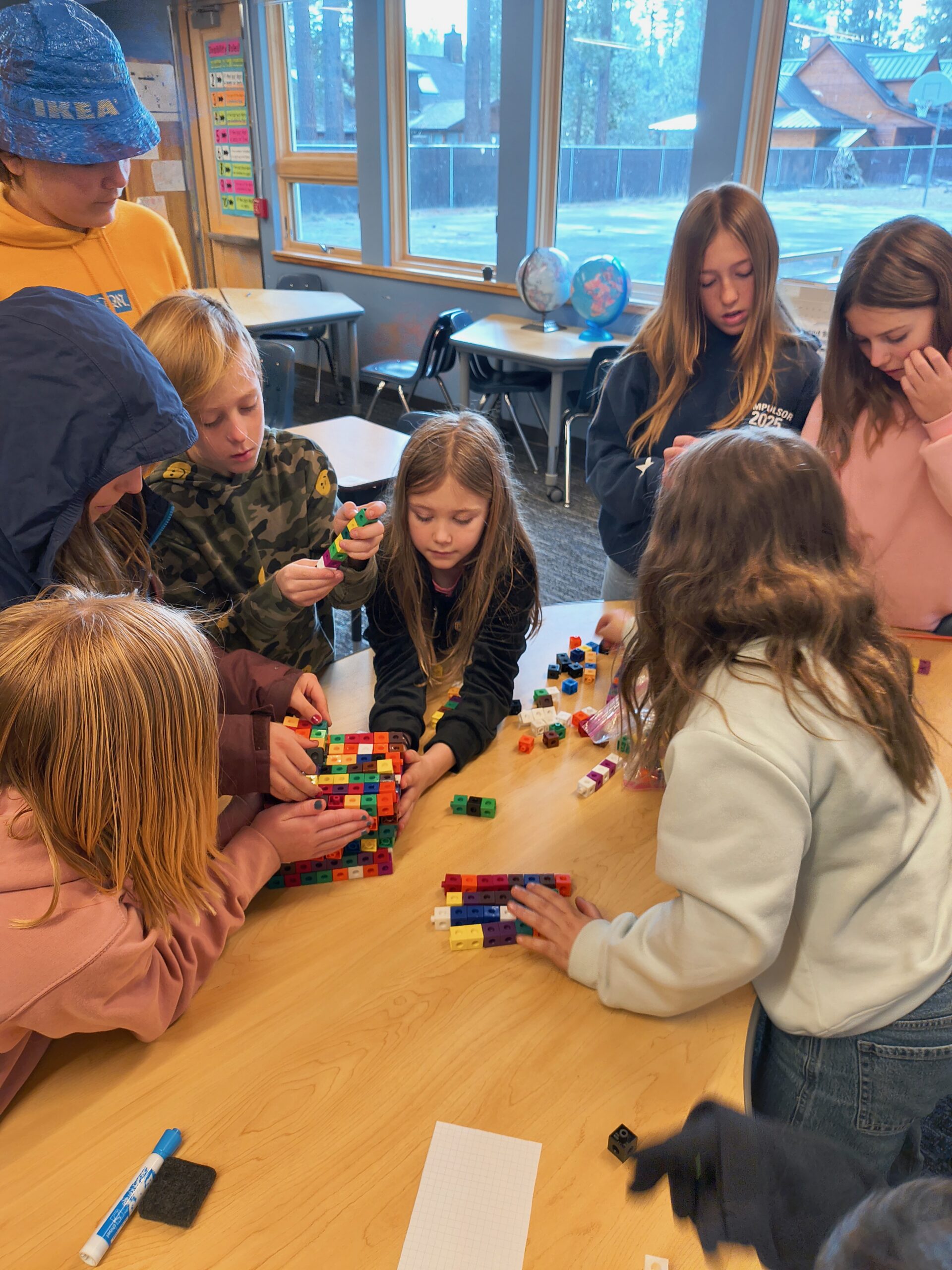 In Math, Blue Bay students have been busy. Most of our students are through with the middle of the year i-ready diagnostic, and are back to their grade-level studies. 7th graders just took a test on Circles, and are on to Percentages. 6th graders are wrapping up Percentages and are taking a test on Monday. Our 4th and 5th graders did a math challenge today that involved recognizing patterns and using linking cubes to build the next shape in the pattern. They used calculations, engineering strategies, and teamwork to solve problems as a group.